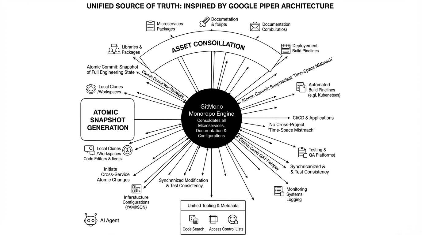 GitMono uses a Git-compatible, petabyte-scale monorepo engine to consolidate all assets (code, configurations, docs) into one atomic, queryable engineering knowledge graph. This unified source of truth eliminates cross-project “time-space misalignment” and allows AI to perform atomic changes across services while ensuring consistent test results.